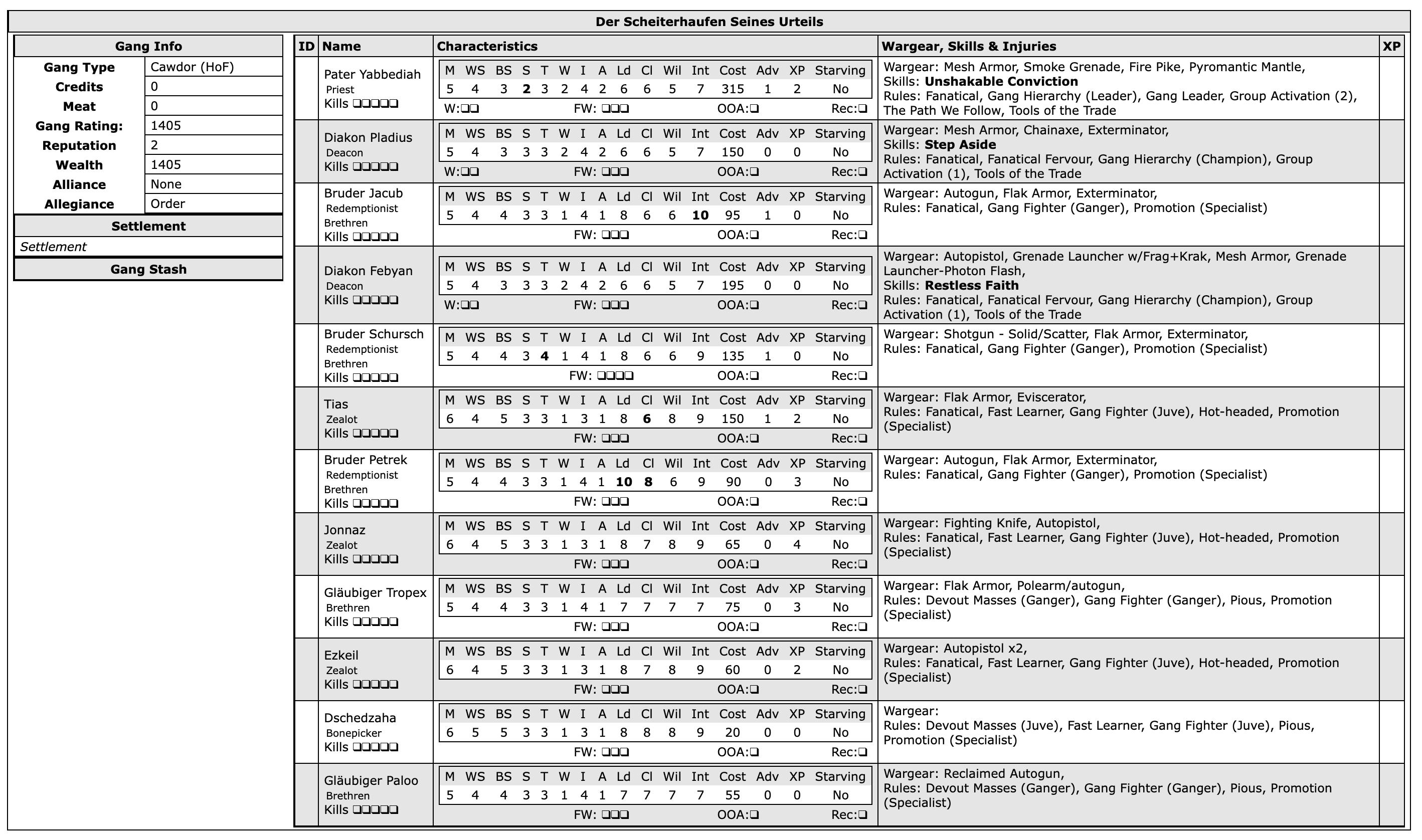 Da es zu Verwirrungen kam bezüglich der Allegiance-Angabe in meinem Gangbogen: Allegiance ist nicht gleichzusetzen mit Alignment (Lawful/Outlaw) sondern eine Angabe für Dark-Uprising-Kampagnen, die hier keine weitere Bedeutung hat. Alternativ könnte da noch Chaos oder eine seiner Ausprägungen stehen, aber das wäre bei den Verfechtern des Glaubens an den Imperator doch etwas seltsam.
