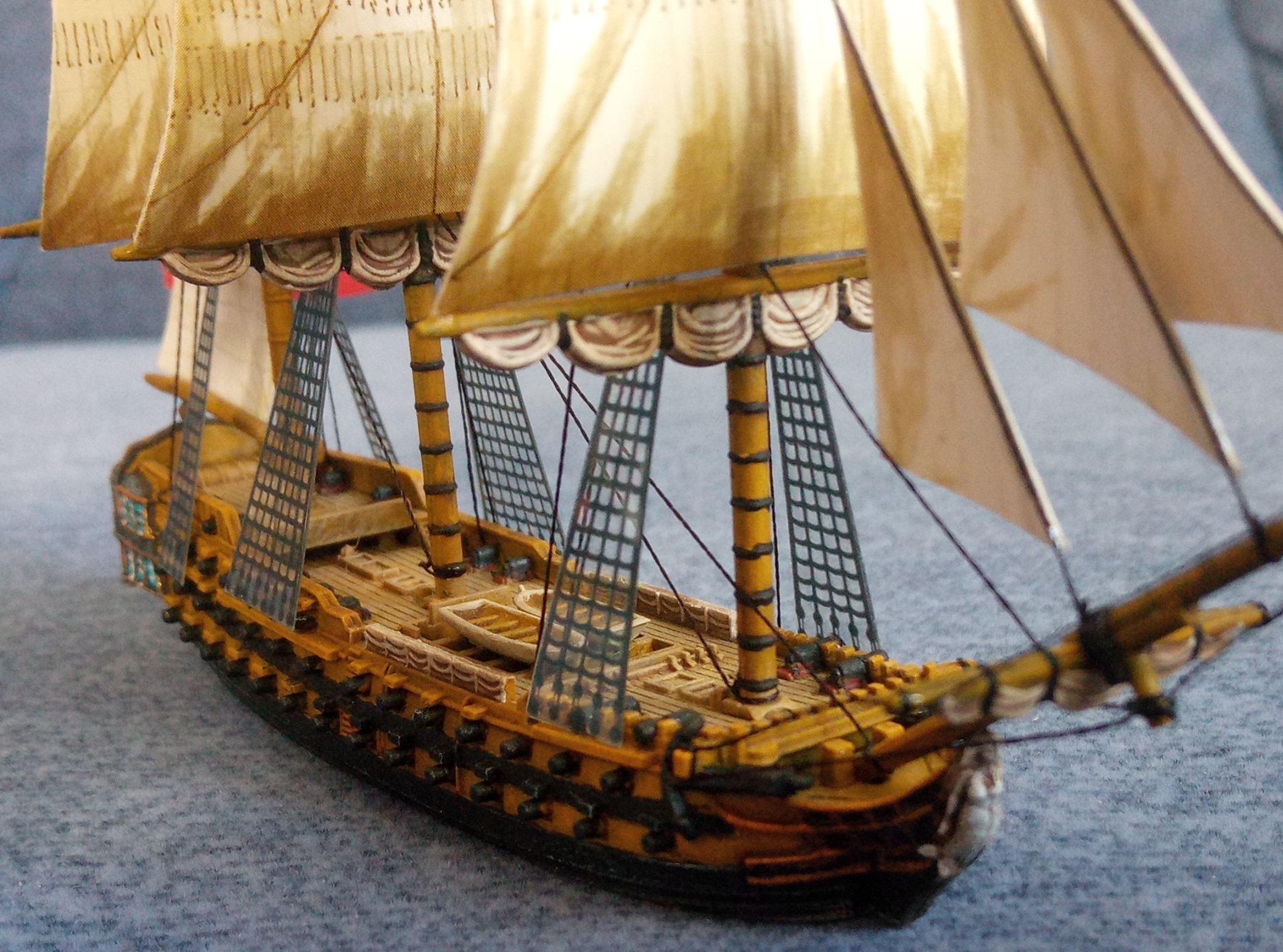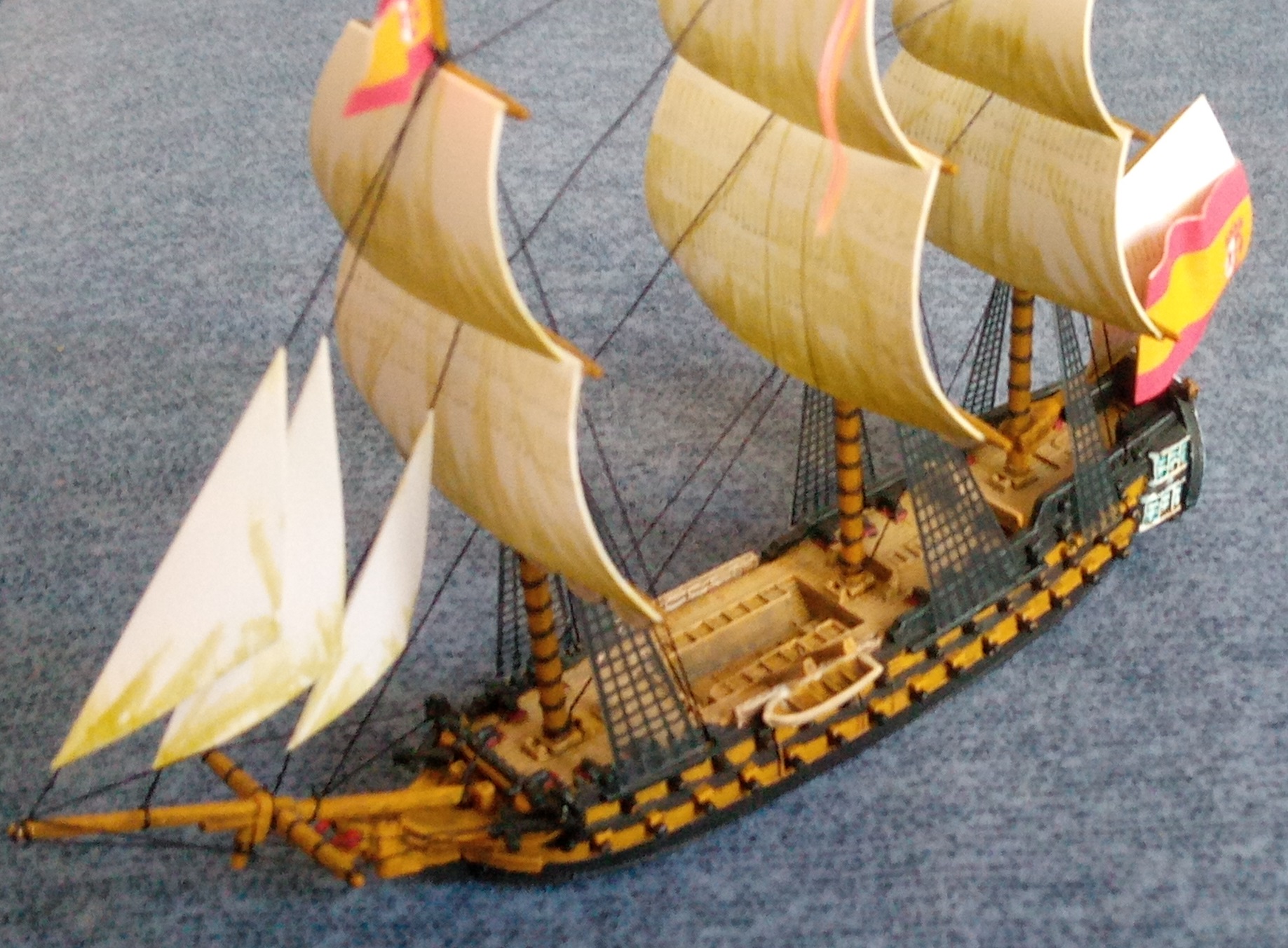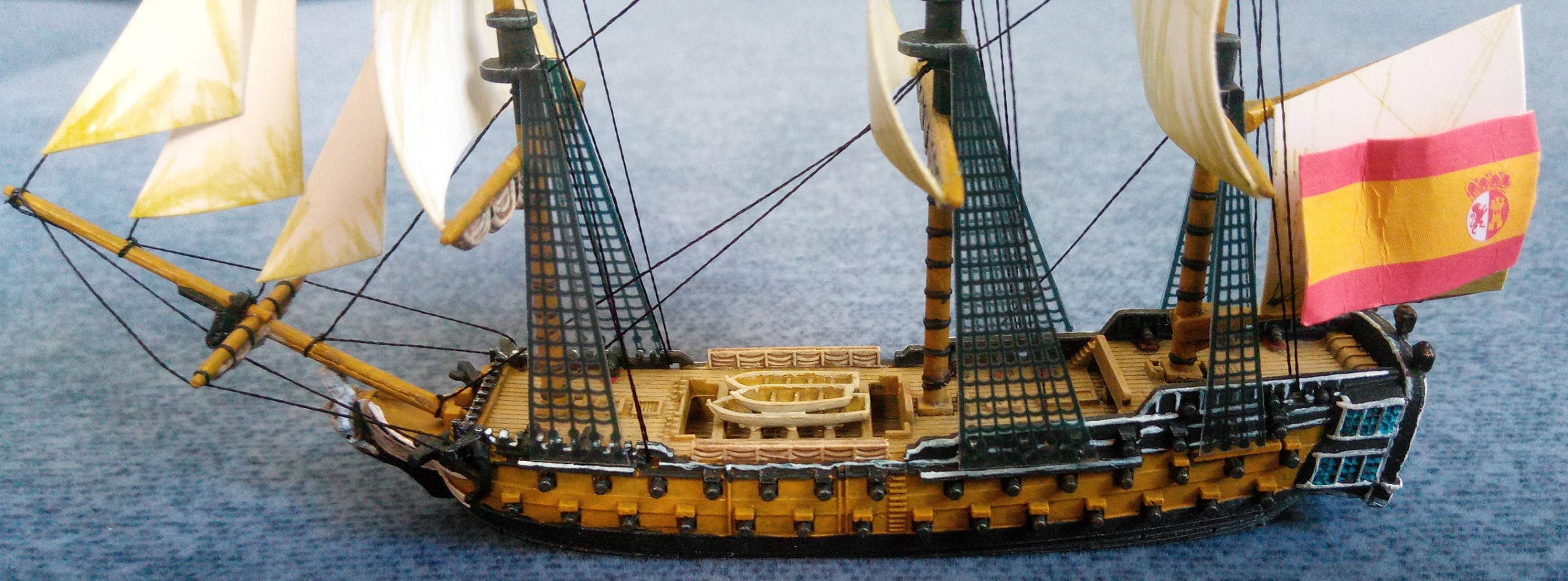 Ziel ist es, alle spanischen Schiffe aus der Schlacht von Trafalgar zu sammeln. Bemalziel ist es, alle auf einer Distanz ab 0,5 m hübsch aussehen zu lassen. Hier nun der erste Stapellauf (entschuldigt den Hintergrund. Ich habe derzeit nichts besseres):