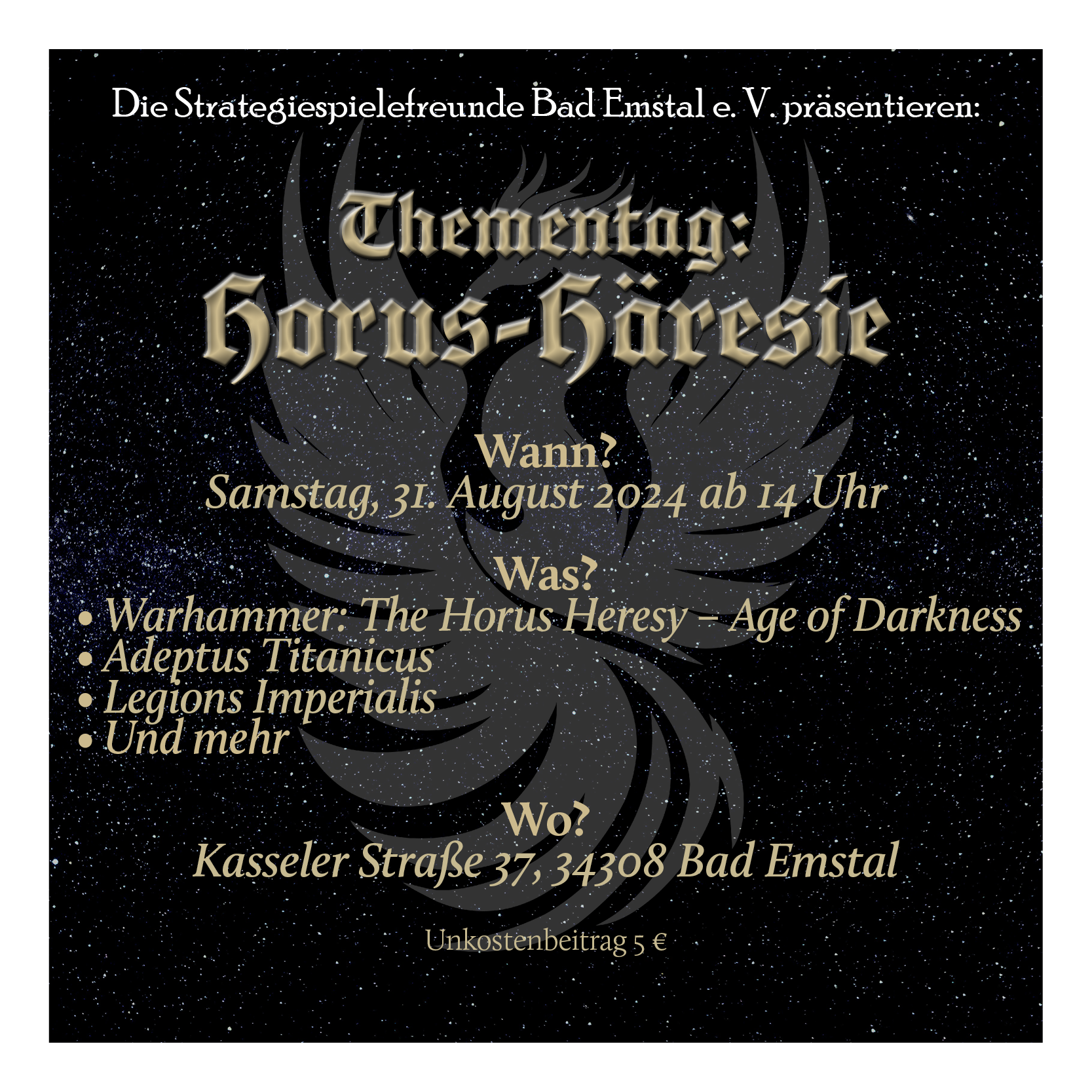 am Samstag, den 31. August 2024 findet ab 14.00 Uhr in den heili…, äh, sakralen Hallen des strategiespielefreundlichen Palasts zu Sand ein Thementag rund die Horus-Häresie statt. Es handelt sich um einen lockeren Spieletag, an dem alle Spielsysteme rund um den Großen Bürgerkrieg des Imperiums gespielt werden können, egal ob The Horus Heresy – Age of Darkness, Adeptus Titanicus, Aeronautica Imperialis, Legions Imperialis oder auch Fanmods für Kill Team oder Battlefleet Gothic.