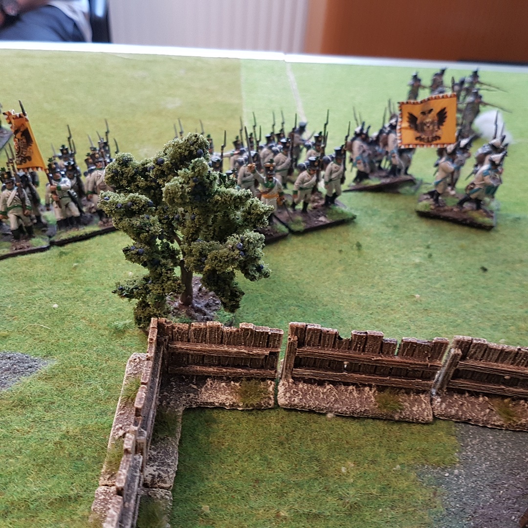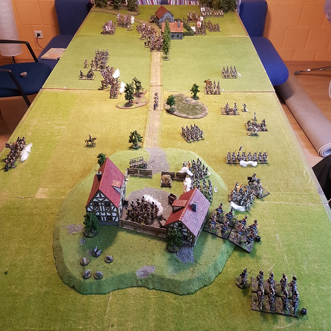 Auf der rechten Flanke der Briten gelang mit der Kavallerie eine Zangenbewegung, während die ersten britischen Verbände sich zaghaft den Hof le Orange betraten, die Mitte verharrte in einer Patt Situation und das russische Kontingent auf der Ösi Seite näherte sich dem Hof le Pope unaufhaltsam... Dank der britischen Kavalerie auf der rechten konnte verhindert werden, dass die zahlenmäßig unterlegenen Highlander Battalione von den Ösis vernichtet werden und so den Hof le Orange für sich beanspruchen. Obwohl sie den Hof le Pope auf ihrer rechten bereits sicher eingenommen hatten, wurden die Russen durch Glück/Pech wieder von dort vertrieben und so blieb der Hof weiterhin umkämpft.