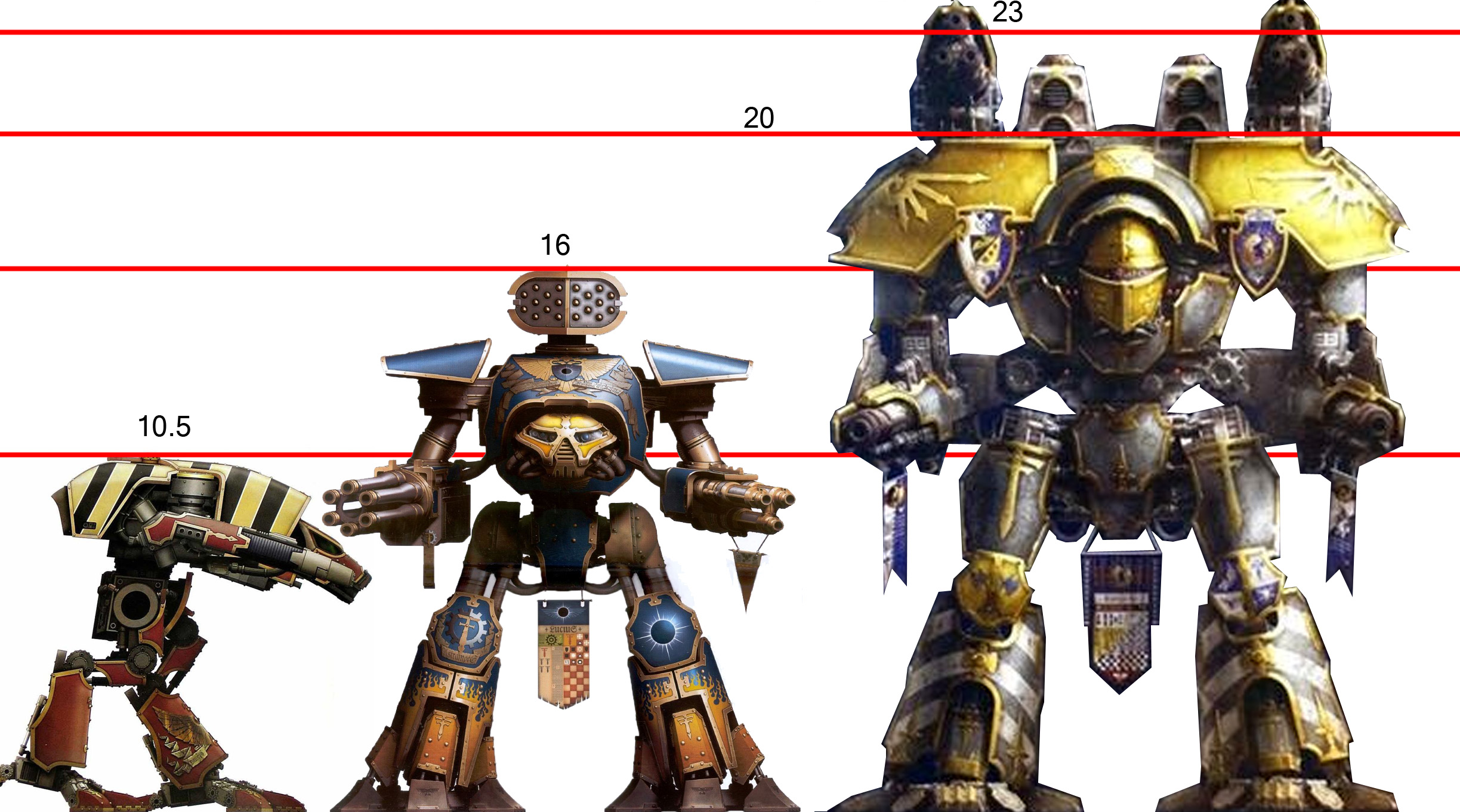 Naja Thingol... du beziehst dich auf diese skizze aber die war eh immer etwas obsolet... also ein Warhound geht bis zur Hüfte das ist absolut konform und passend... ich empfinde seine Schulterwaffen als etwas Monströs... ansonsten ist halt sein Problem das er auf grund dessen das es ein Marsschema ist sehr Gedrungen wirkt... das verzerrt seine Größe... das wäre bei dem Lucius Schema nicht so schlimm... aber ich bin halt auch eher ein Freund des alten Epic Warlord Titan... bin auch mal auf das innenleben gespannt ob der Princeps in nem Tank hockt oder Sitzt ... und wie Groß die Kommandobrücke ist....