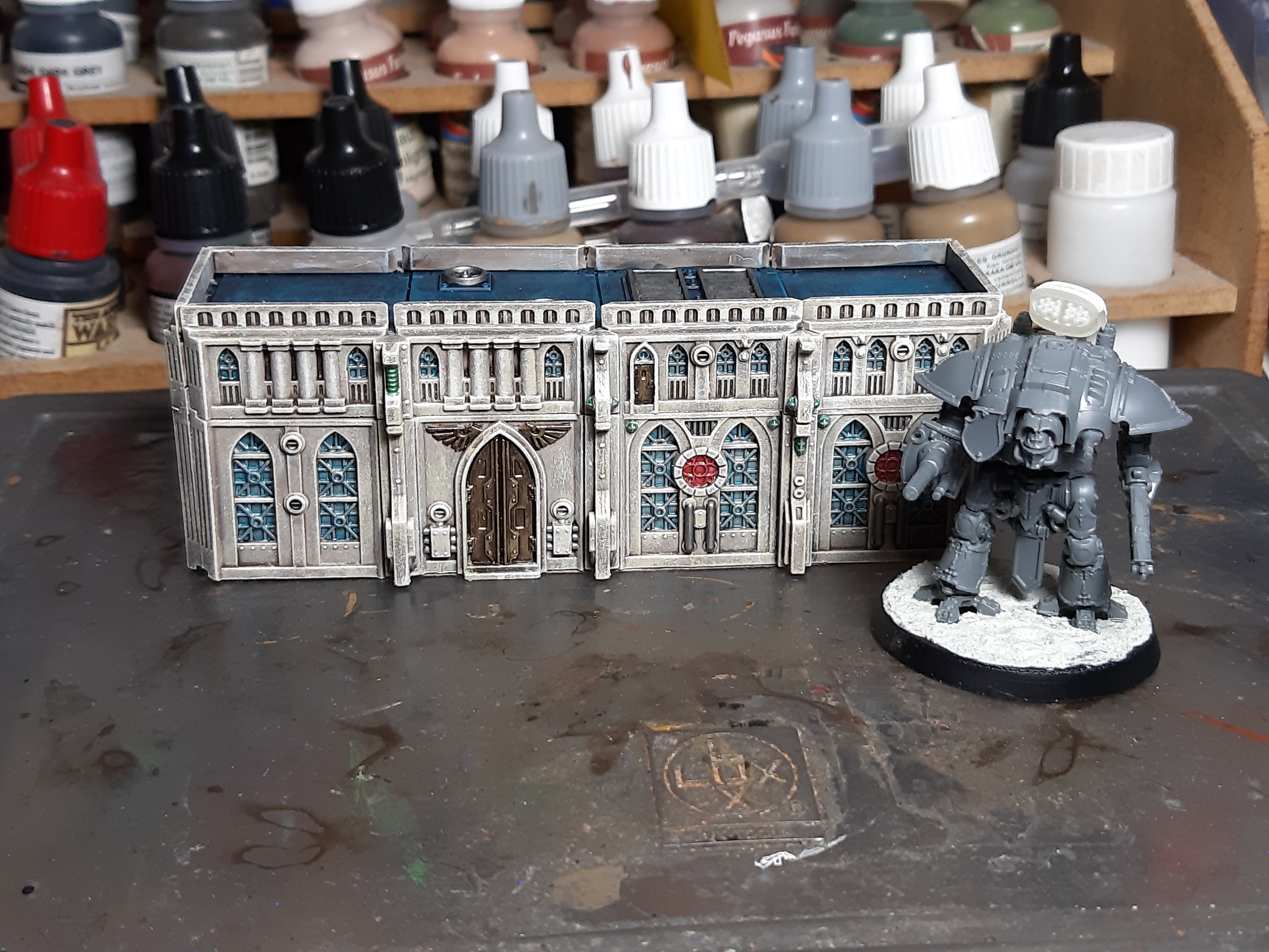 Momentan stehen zwei Dinge an. Einerseits will ich heute an den bemalten Titans und Knights mit Ölfarben Rostspuren anbringen, andererseits befinden sich die AT-Gebäude in Bemalung.