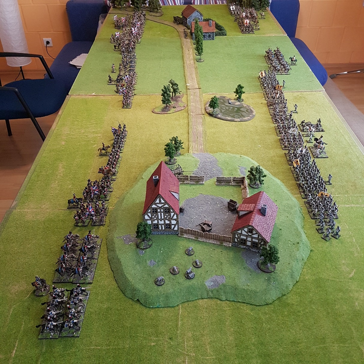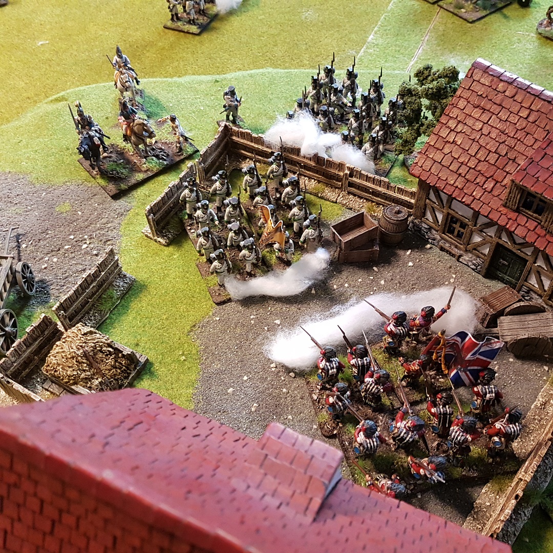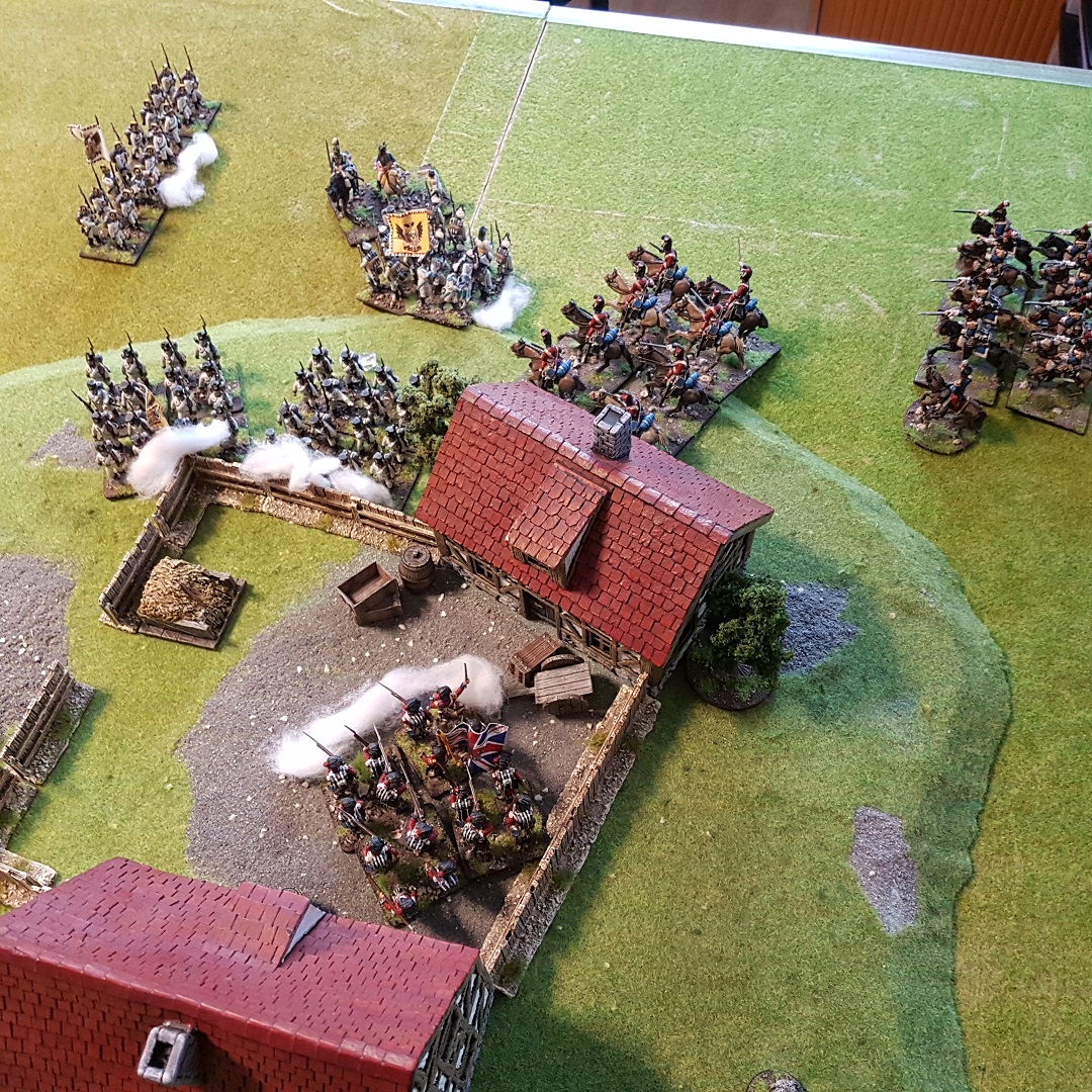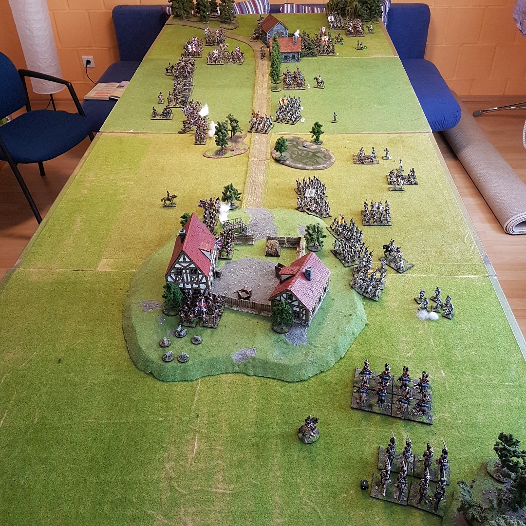 Auf der rechten Flanke der Briten gelang mit der Kavallerie eine Zangenbewegung, während die ersten britischen Verbände sich zaghaft den Hof le Orange betraten, die Mitte verharrte in einer Patt Situation und das russische Kontingent auf der Ösi Seite näherte sich dem Hof le Pope unaufhaltsam... Dank der britischen Kavalerie auf der rechten konnte verhindert werden, dass die zahlenmäßig unterlegenen Highlander Battalione von den Ösis vernichtet werden und so den Hof le Orange für sich beanspruchen. Obwohl sie den Hof le Pope auf ihrer rechten bereits sicher eingenommen hatten, wurden die Russen durch Glück/Pech wieder von dort vertrieben und so blieb der Hof weiterhin umkämpft.