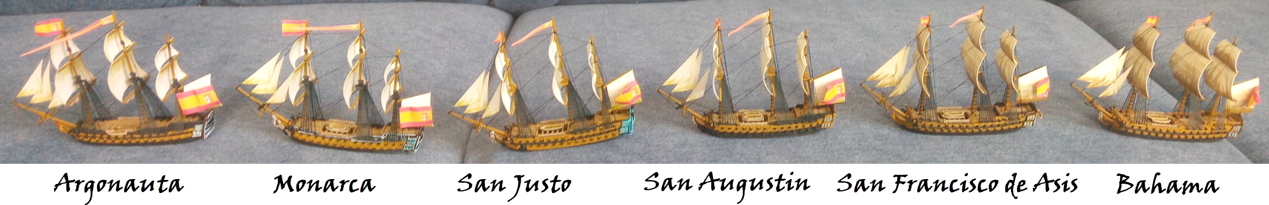 Ziel ist es, alle spanischen Schiffe aus der Schlacht von Trafalgar zu sammeln. Bemalziel ist es, alle auf einer Distanz ab 0,5 m hübsch aussehen zu lassen. Hier nun der erste Stapellauf (entschuldigt den Hintergrund. Ich habe derzeit nichts besseres):