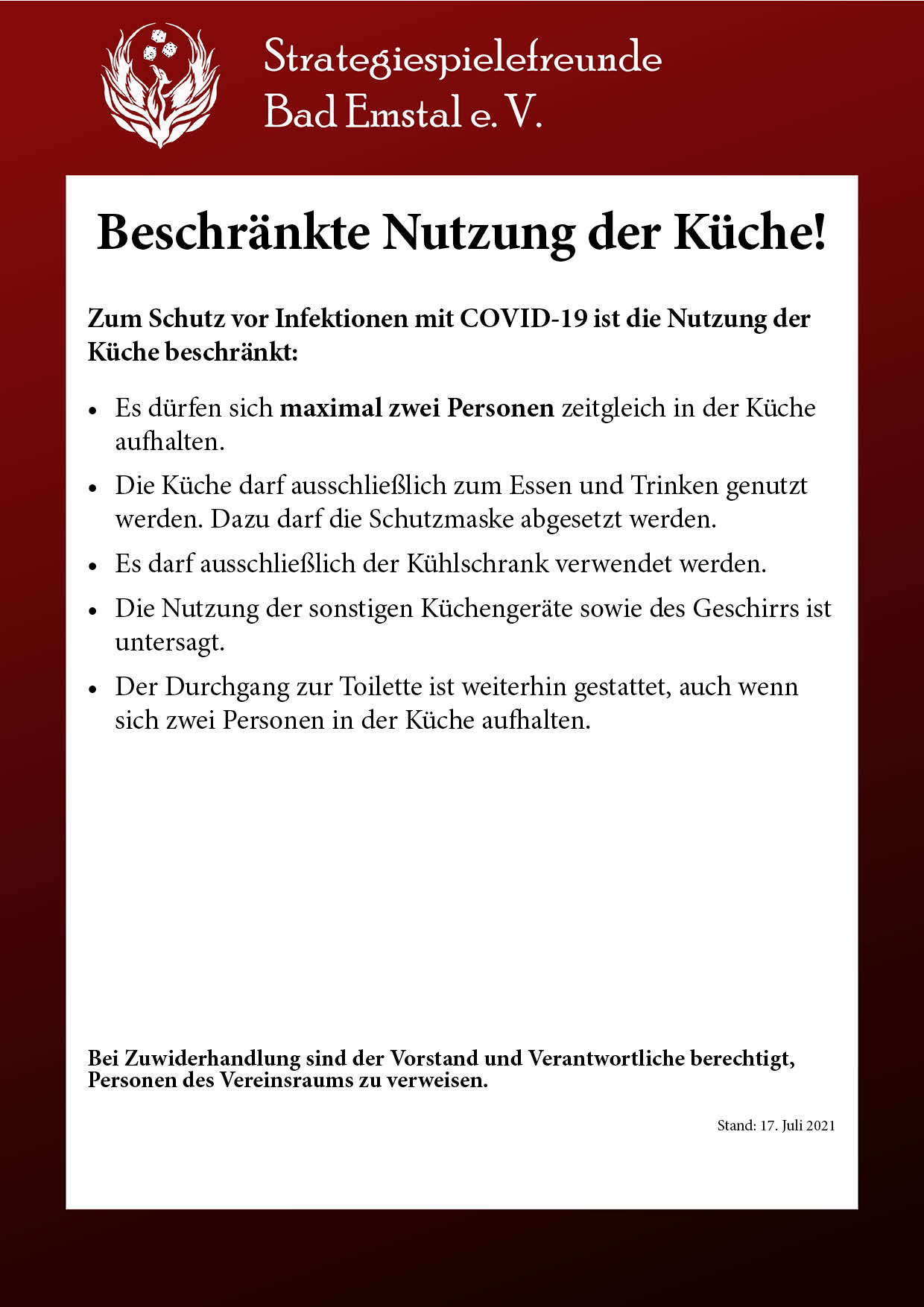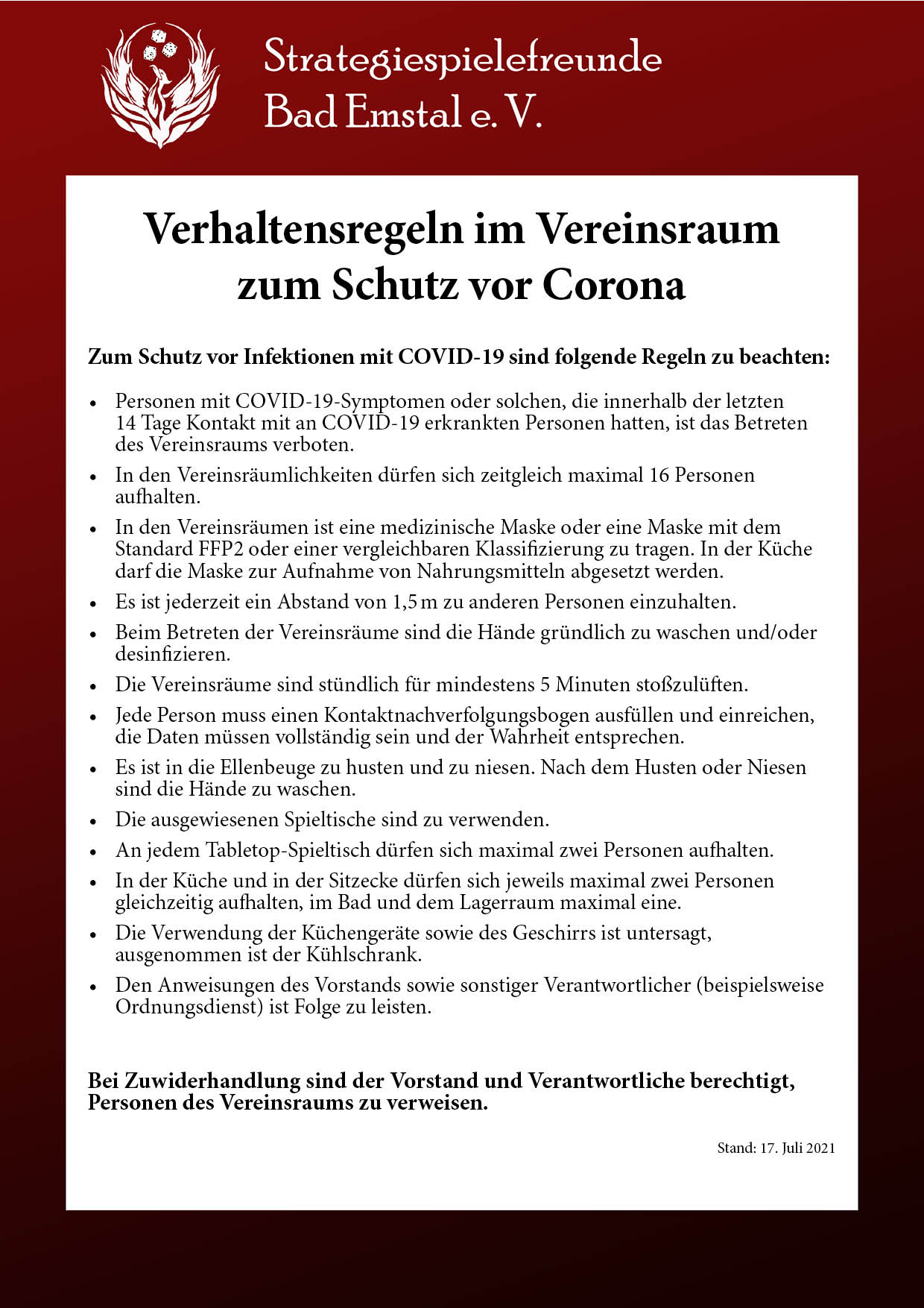 Wir haben leider nur die Fläche, um 16 Personen Zutritt zu den Vereinsräumen zu gestatten. Aus diesem Grund steht die Teilnahme an Spielwochenenden grundsätzlich nur Vereinsmitgliedern der Strategiespielefreunde Bad Emstal e. V. offen. Sollte sich im Verlauf eines Veranstaltungstags abzeichnen, dass aufgrund der Teilnehmerzahlen noch Kapazitäten zur Verfügung stehen, kann der Ordnungsdienst bzw. der Vorstand auch Fördermitgliedern und Gästen den Zutritt gestatten.